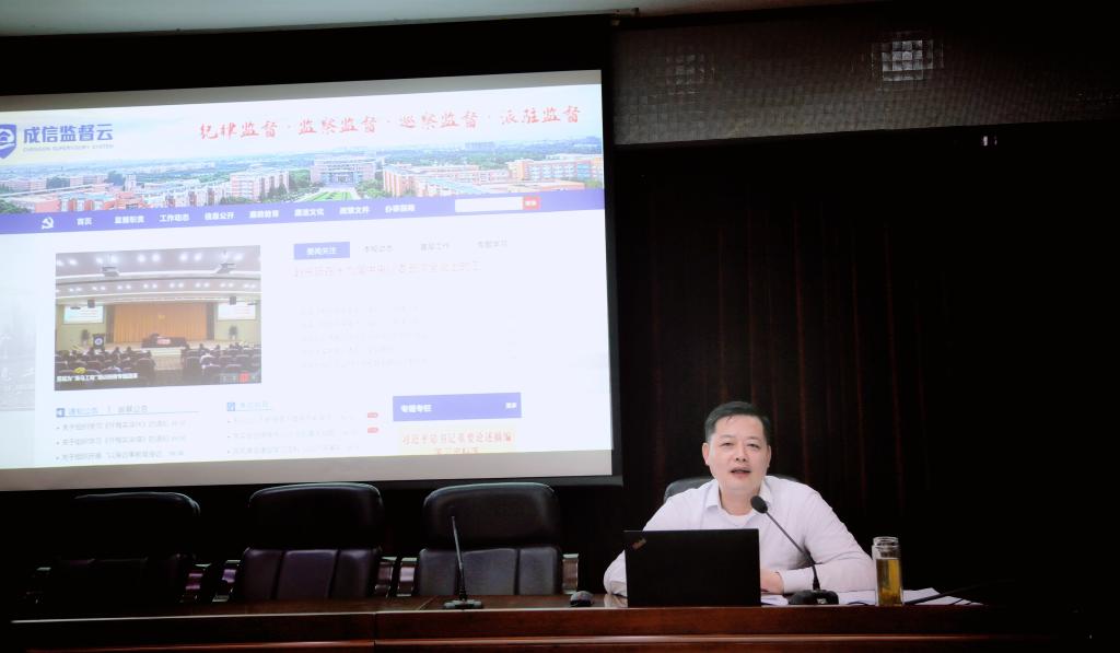 省纪委监委驻校纪检监察组组长,学校党委副书记、纪委书记雷超介绍了高校当前管党治校现状,通报了近年来我省高校发生的一些典型案例,结合案例剖析了高校人员在遵规守纪方面易犯的6类错误。同时,他从教育对象、教育内容、教育实施主体、工作要求及具体安排等方面简要介绍了即将在全校常态开展的纪律规矩教育。会上,雷超宣布启动我校“成信监督云”专题网站,介绍了网站布局及相关内容。他提到,推出“成信监督云”专题网站,以“四项”监督为主体内容,旨在通过监督营造风清气正的政治生态、风和日丽的育人环境和风生水起的科创局面。